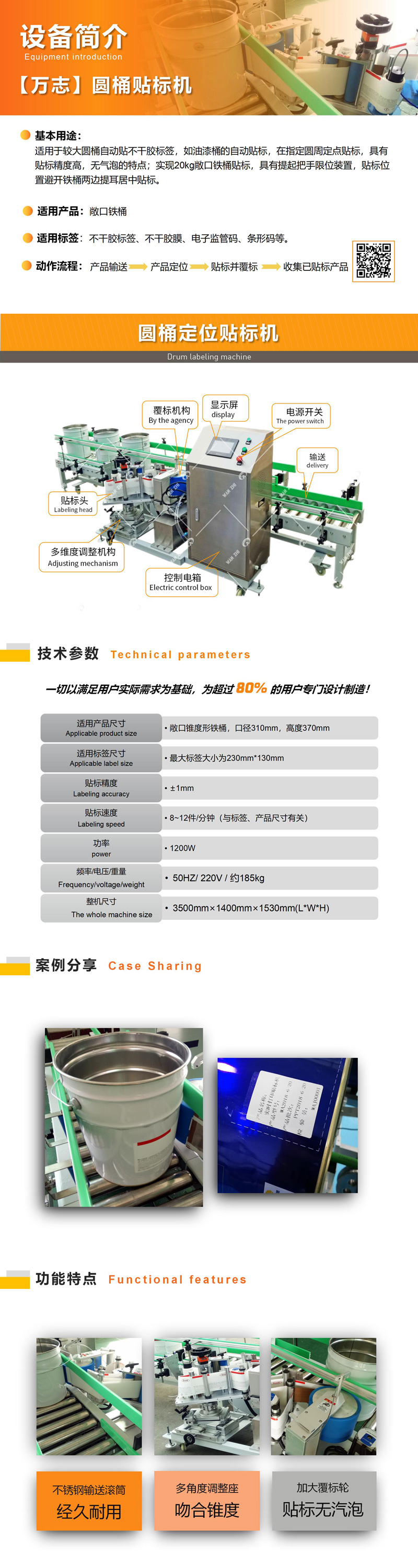 全自動油漆桶貼標機適(shì)用於油漆桶的自動貼標,圓周定點貼標,具有貼標精度(dù)高,無氣泡的特點;實現(xiàn)20kg敞口鐵桶貼標,可實(shí)現定位貼標,具有提起(qǐ)把手限位(wèi)裝置,貼(tiē)標位置避開鐵桶(tǒng)兩邊提(tí)耳居中貼標。