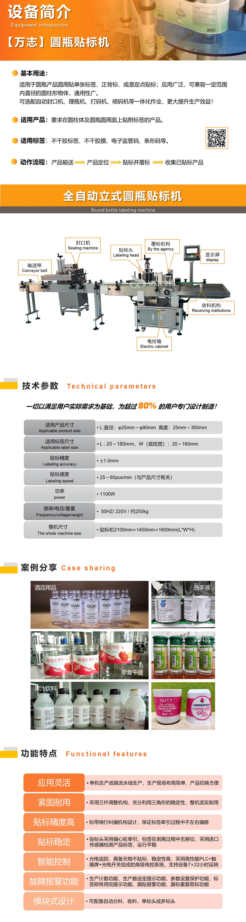 基本用途 全自動圓瓶貼(tiē)標機適用於在圓瓶(píng)類物體圓(yuán)周麵貼標簽,可(kě)貼單標和雙標(biāo),正背雙標間距可靈活調整,如zheli喱水圓瓶、食品圓罐等貼標,廣泛應用於化妝品、食(shí)品(pǐn)、醫藥、消毒水等行業。選配圓周定位檢測裝置,可實現在圓周麵指定位置(zhì)貼標。可根據(jù)需(xū)求選配色帶打碼機(jī)、噴碼機和封口機(jī)等; 或來電谘(zī)詢400-8860822/13711954178。