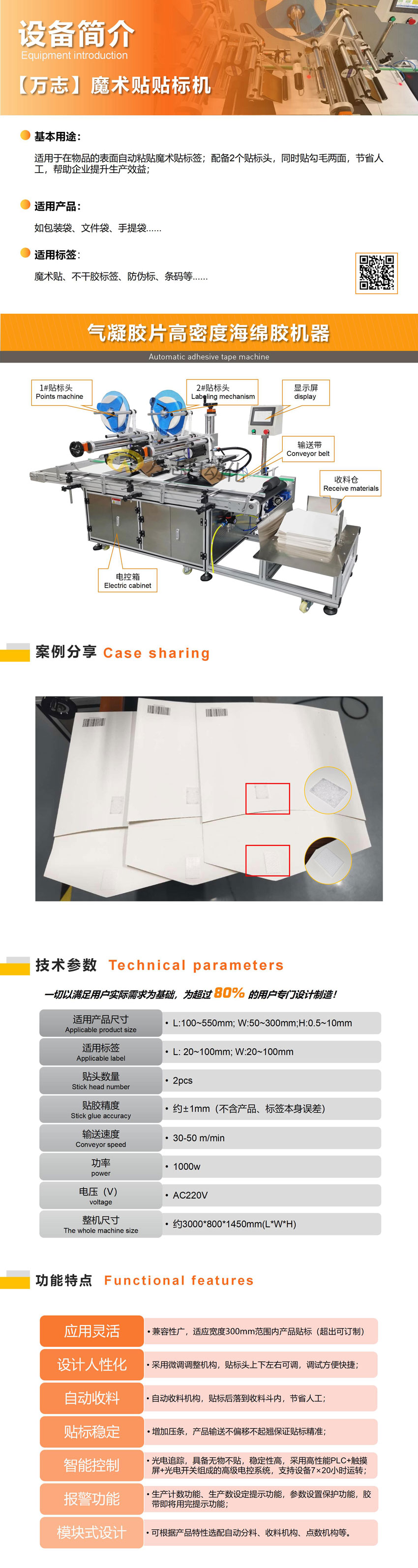 基(jī)本用(yòng)途 包裝盒自動貼魔術貼標簽機器適用於在包裝(zhuāng)袋/盒或禮盒手提袋上(shàng)自動粘貼魔術貼,勾毛兩麵同時貼(tiē)標(biāo);