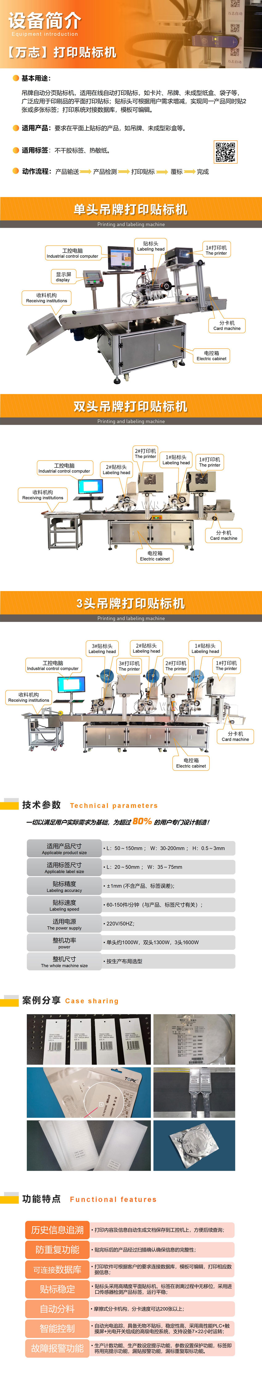 基本用途(tú)吊牌在線打印貼標機適用於平麵產品實時打印貼標,如卡片、吊牌(pái)、IC卡、代金券、未成(chéng)型紙盒、袋子等,廣泛應用於印刷品的平麵打印貼標;雙標(biāo)頭設計實現在同一產(chǎn)品不同水(shuǐ)平位置同時貼2張或多張標簽;打印係統對接數據庫