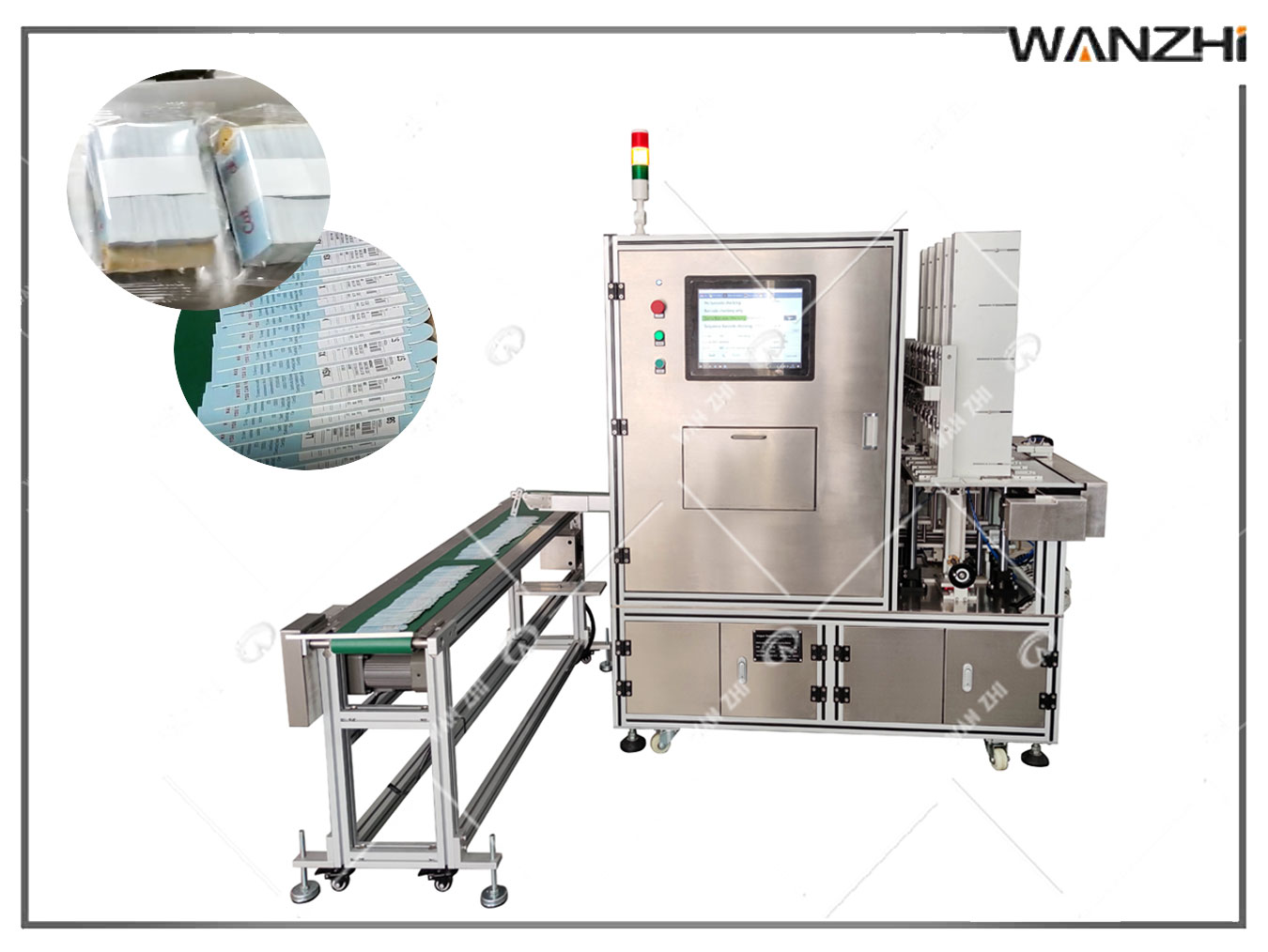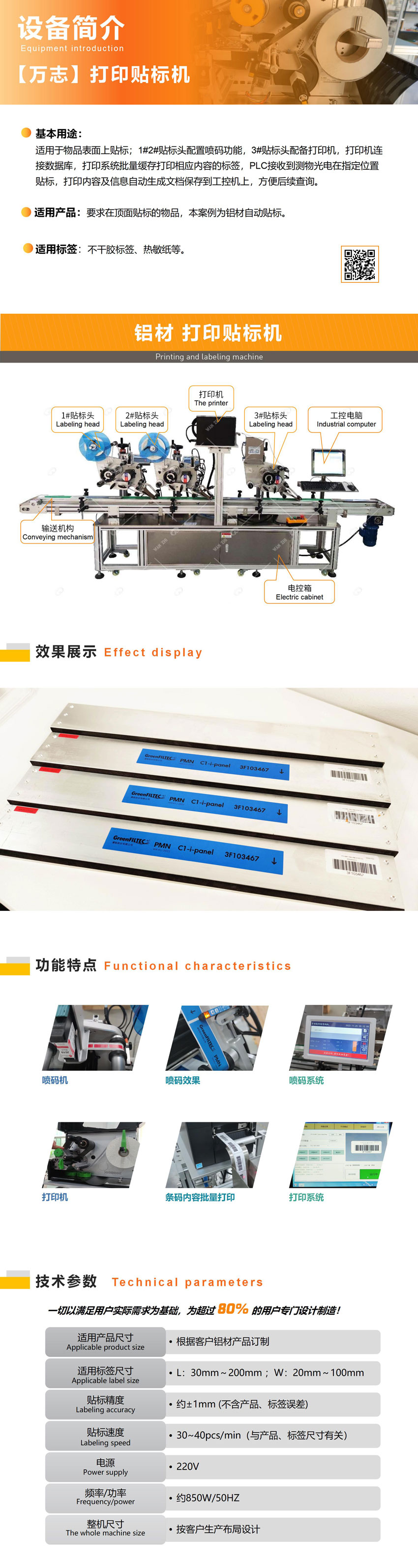 適用於物品表麵上(shàng)貼標;1#2#貼標頭配置噴碼功能,3#貼標頭配備打印機,打(dǎ)印機連接數(shù)據庫,打印係(xì)統批量緩存打印相應內容的標簽,PLC接收到(dào)測物光電在指定位置貼標,打印內容及(jí)信息自動(dòng)生成(chéng)文檔保存到工控機(jī)上,方便後續查詢。