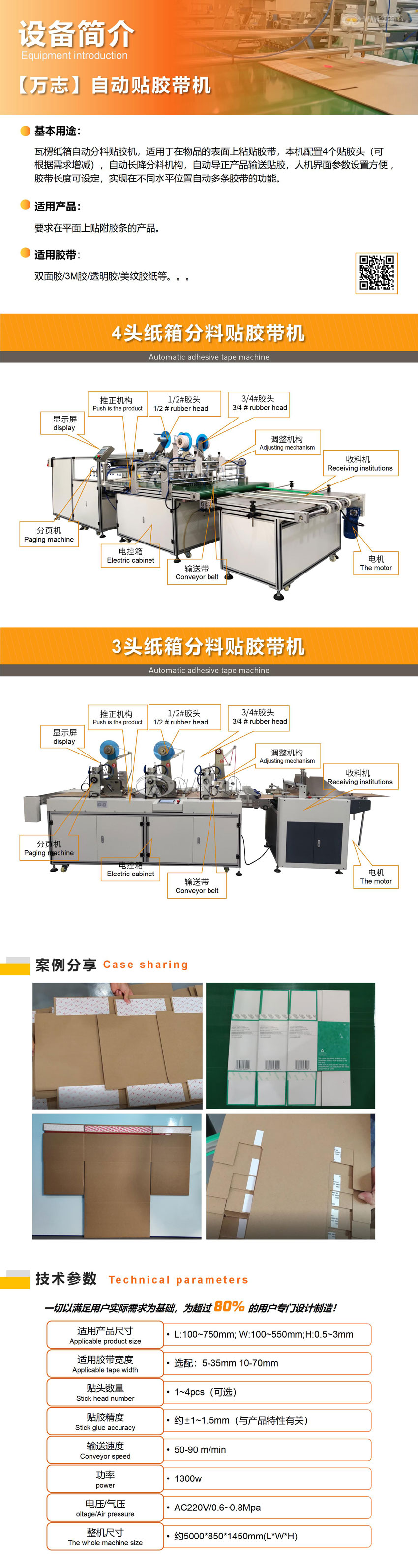 基(jī)本用途 全自(zì)動紙箱貼雙麵膠/透明膠機本機型主要(yào)用於各類紙箱、紙卡等印(yìn)刷品表(biǎo)麵(miàn)自動切斷、粘貼雙麵膠帶或透明膠帶。配(pèi)置2個貼膠頭,實現輸送方向同時貼2條膠帶,貼(tiē)合長度可任意設定;貼膠頭(tóu)可根據用戶需求選配;設備可選(xuǎn)自動分(fèn)料/收料機構,工作效率(lǜ)約50-90m/min(效率與產品尺寸有關);