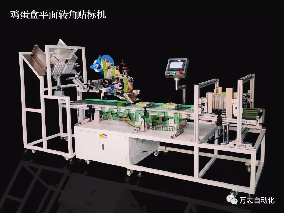 適用於產品的上平麵貼(tiē)標,如雞蛋盒、藥盒等方形產品(pǐn)上平麵(miàn)及拐角貼標;機械手自動取盒送到輸送上(shàng)進行貼標(biāo)後自動收集產品,本案例為雞蛋盒貼標,性能穩定,大大提高(gāo)生產效率;