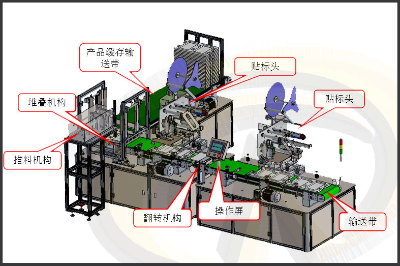 自動啟動——>人工放料 ——>1#標頭攔停產品貼標——>180度(dù)自動翻轉(zhuǎn)產品——>2#標頭攔停產品(pǐn)貼標(biāo)——>產品堆疊——>推送推疊產(chǎn)品——>人工收料。