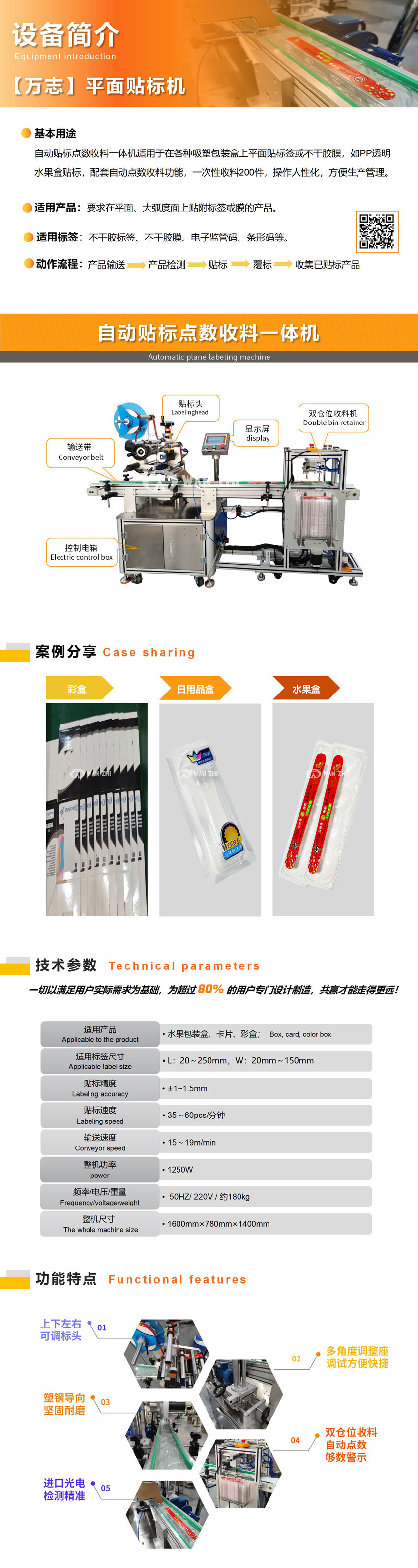 適用於在各種吸(xī)塑包裝盒上平麵貼標簽或不幹(gàn)膠膜,如PP透明水果盒貼(tiē)標,配(pèi)套(tào)自動(dòng)點數收料功能,一次性收料200件,操作人性化,方便生產管理。
