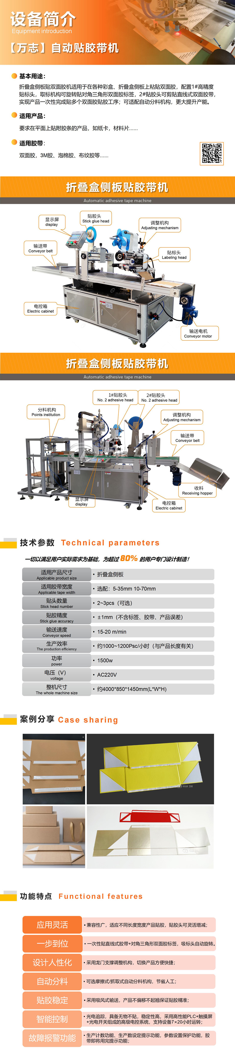 折疊盒側(cè)板貼雙麵膠機適用於在各種彩盒、折疊盒側板上(shàng)粘貼雙麵(miàn)膠,配置1#高精度貼標頭(tóu),取標機構可旋轉貼對角三角形雙麵膠標簽,2#貼膠頭可剪貼直線式(shì)雙麵膠帶(dài),實現(xiàn)產品一次性完(wán)成貼多個雙麵膠(jiāo)貼膠工序;可(kě)適配自動分料機構(gòu),更(gèng)大提升產能。
