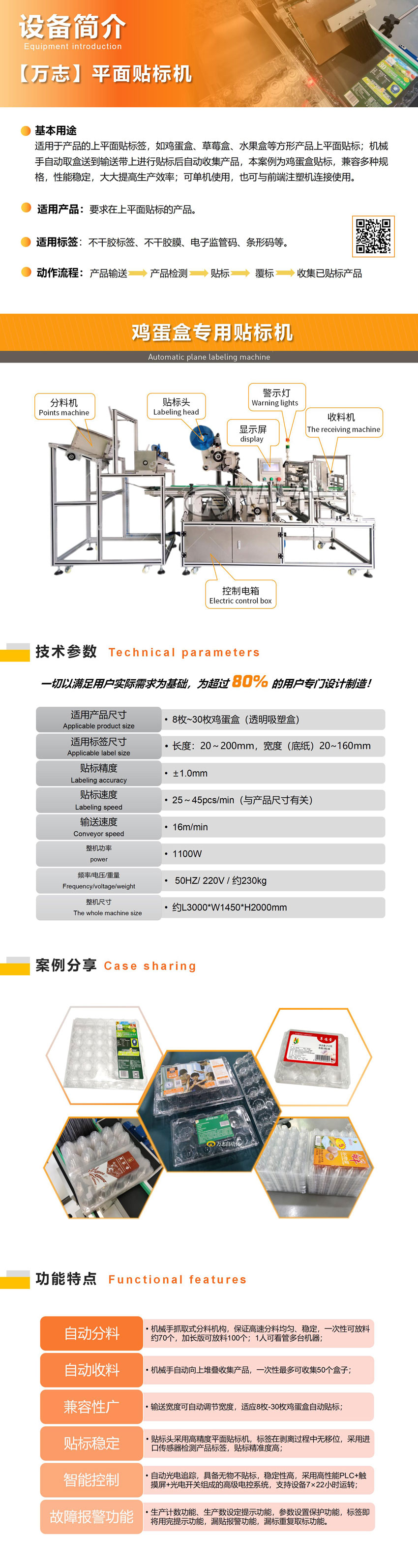 雞蛋盒自動上(shàng)下(xià)料(liào)貼標機適用(yòng)於產品的上平麵(miàn)貼標機,如雞蛋盒、草莓盒、水(shuǐ)果盒等方形產品上(shàng)平麵(miàn)貼標;機械(xiè)手自動取盒送到輸送上進行貼標後自動收集產(chǎn)品,本案例為雞蛋盒(hé)貼標,兼容多種規格,性能穩定,大(dà)大提高生產效率;可單機使用,也可與前端注塑機連接(jiē)使用。