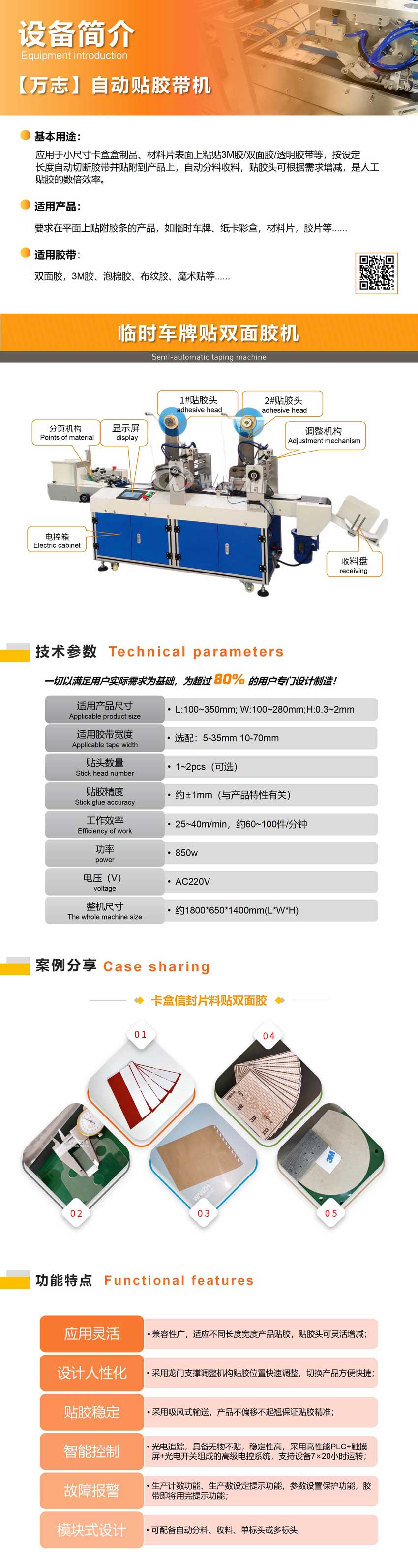 基本功能 應用於小(xiǎo)尺寸卡(kǎ)盒盒製品、材料片表麵上粘貼3M膠/雙麵膠/透明膠帶等(děng),按設定長度自動切斷(duàn)膠帶並貼附到產品上,自動(dòng)分料收料,貼膠頭可根據需求增減,是人(rén)工(gōng)貼膠的數倍效率。