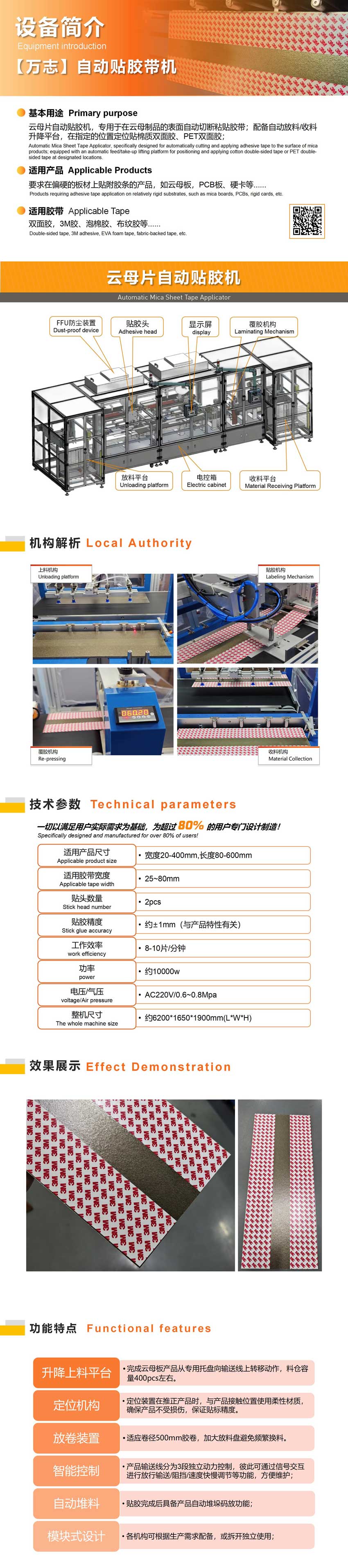 雲母片自動貼膠機,專用於在雲母製品的表麵自動切斷粘貼(tiē)膠帶;配備自動放料/收料升降平台,在指定的位置定位貼棉質雙(shuāng)麵膠、PET雙麵膠(jiāo);