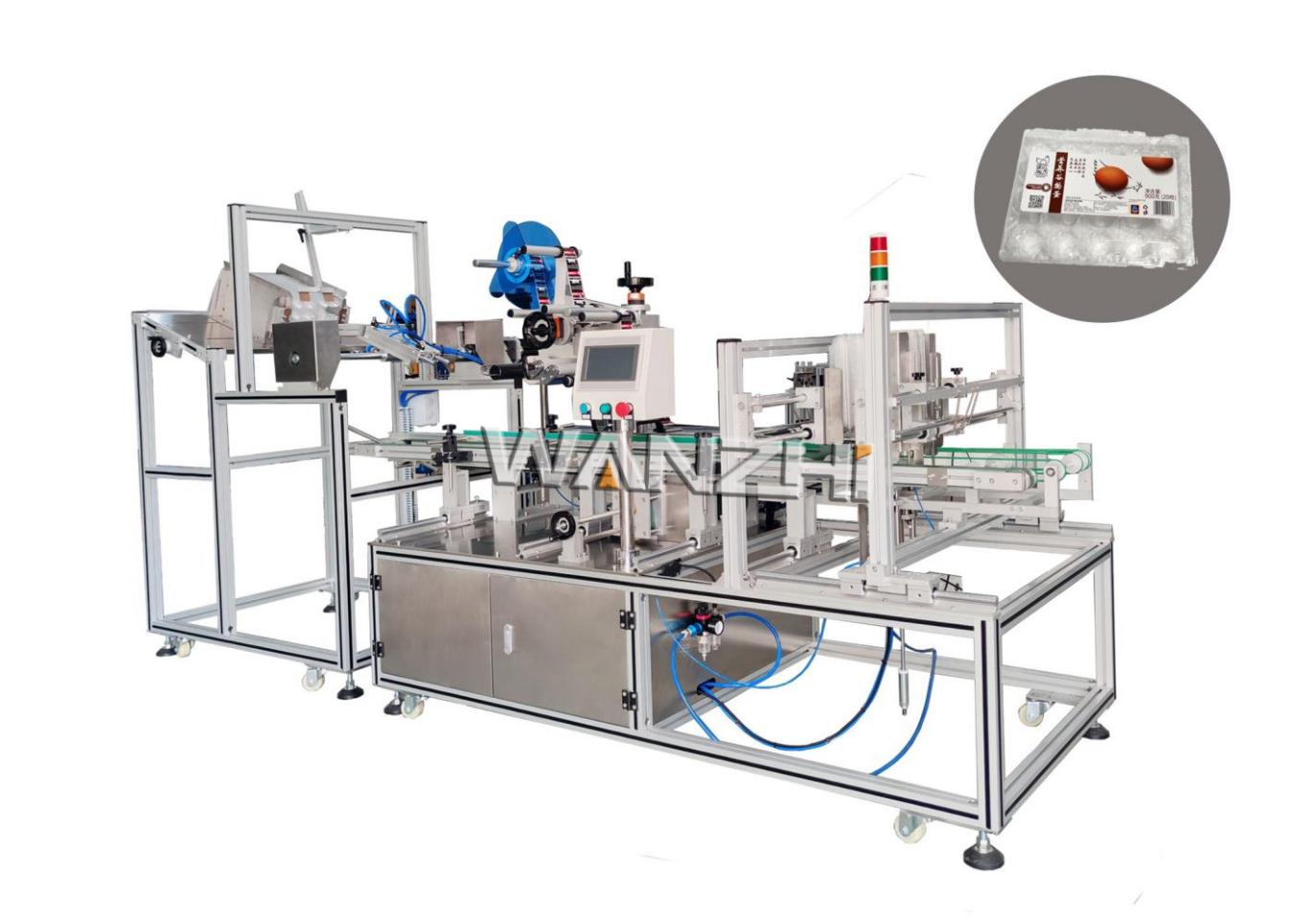 適用於吸(xī)塑包裝盒表麵貼標,如水果盒、雞蛋盒等;機械手自動取盒送到輸送上進行貼標後自動收(shōu)集產品(pǐn),性能穩(wěn)定生產效率1200~2300件(jiàn)/小時;可(kě)單機使用,也可與前端注塑機連(lián)接(jiē)使用(yòng)。