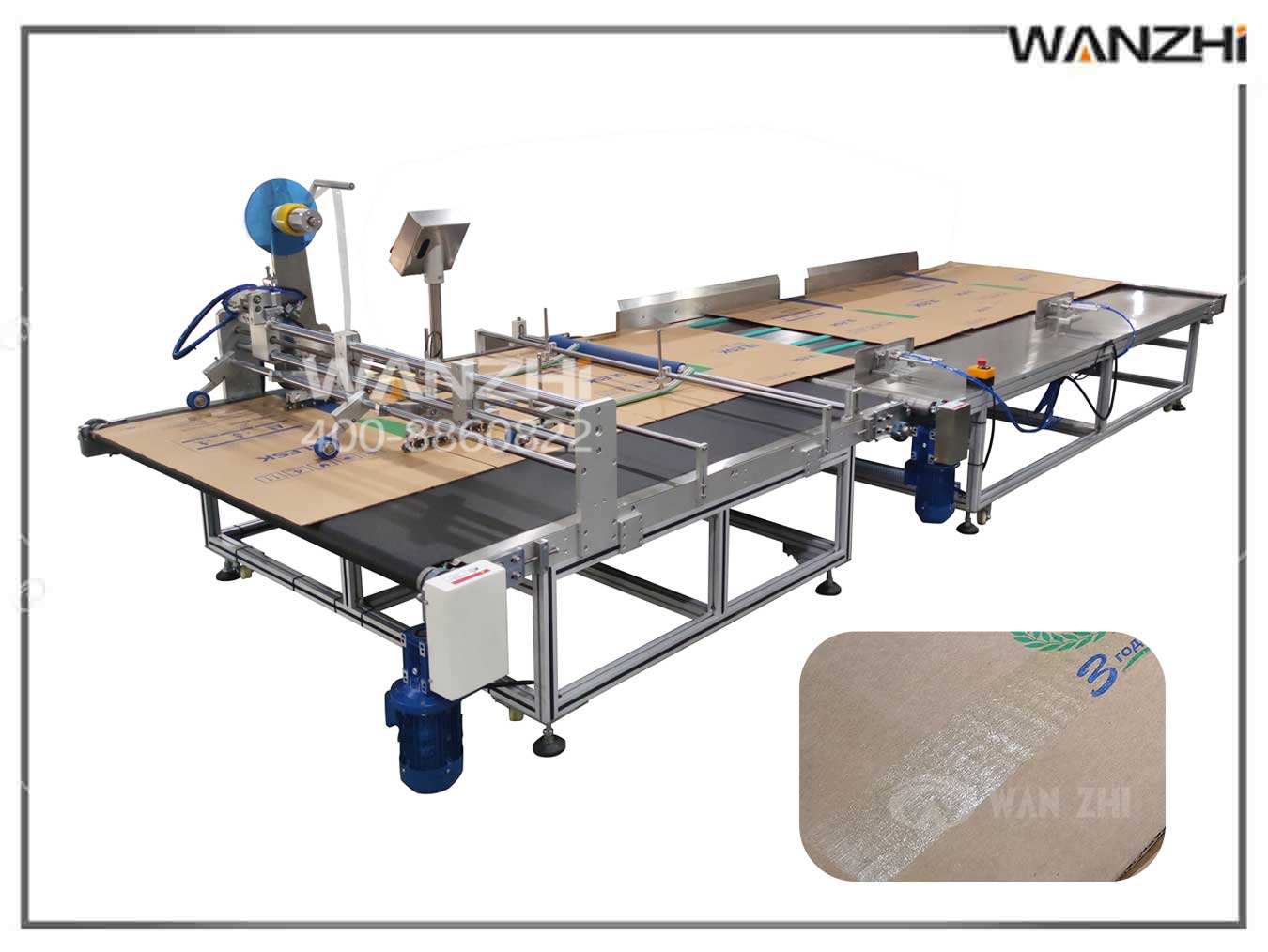 WZ-866 紙(zhǐ)箱自動貼抗(kàng)撕裂膠帶機應用於紙製品瓦楞紙表麵(miàn)上粘貼透明(míng)膠(jiāo)帶,起到(dào)防止紮帶紮破加固紙箱承重的作用,可配備自動分料機構,人工放紙箱到料倉自動流到輸送後在指定位置粘貼膠帶。適(shì)用於在各種物品的上平麵粘雙麵膠/3M膠,根據(jù)貼膠(jiāo)長度要求自(zì)動裁切;如海報、紙卡、盒子、袋子等;可結合產品考慮選配自動送料機構,自動收料機構等,取代人工更高效。